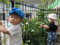 登園すると「大きくなったかな?」と様子を見に行き、水やりをして大事に育ててきた夏野菜。4歳児のトマトや5歳児のナス、オクラ、キュウリが大きく育ちました。収穫した野菜は、給食のメニューに入れてもらいみんなで美味しく食べました。育てる楽しさや難しさ、収穫の喜び、野菜の美味しさなど、たくさんのことを感じた子どもたちです。