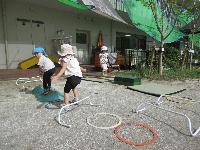 小さなハードルをジャンプしたり、一本橋を渡ったり、色々な動きを楽しんでいます。
