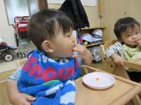 上手に手づかみして、お口にパクッ。手指を使って自分で食べられるようになってきました。