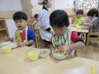 スプーンを使い、自分で食べようとする姿が見られています。持ち方を知らせながら、楽しく食事ができるようにしています。