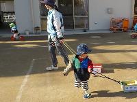 引き箱に荷物を乗せて出発進行!力強く引っ張ったり、保育者と一緒に園庭を散歩したりしています。