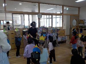 2月3日(火曜日)、園内に「鬼は外ー!」の声が響き渡りました。なんと!東習志野こども園にも鬼が来たのです。鬼に変身した年長組のこどもたちが優しく驚かす姿がありました。鬼の正体が年長組だとわかり、ほっと安心していたこどもたちでした。