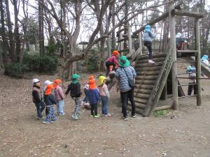 年中組と年長組は、今年1年間、なかよしペアの2人組での活動を積極的に取り入れてきました。一緒にふれあい遊びをしたり、給食を食べたりして仲を深めてきたこどもたち。年長組の卒園の前に一緒にお別れ散歩に行ってきました。実籾近隣公園まで手をつないで歩き、道中もいろいろな話をしながら楽しむ姿が見られました。一緒にたくさん遊ぶことができてどのペアもうれしそうでした!