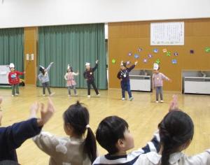 幼児組のお楽しみ会では、各学年のクリスマス制作の紹介をしたり、みんなで「あわてんぼうのサンタクロース」の歌を歌ったりして楽しみました。家庭科実習に来ていた習志野高校のお姉さん方の演奏もあり、楽しい時間を過ごしました。