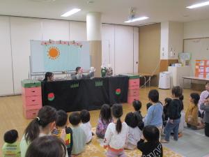 「3びきのこぶた」の出し物に釘付けなこどもたち