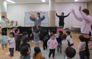 乳児組全員が集まってお楽しみ会が開かれました。先生サンタの出し物に釘付けのこどもたち。♪ふうせんの歌の替え歌バージョンのパネルシアターは口ずさみながら楽しんでいました。