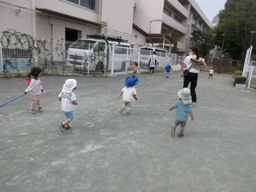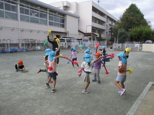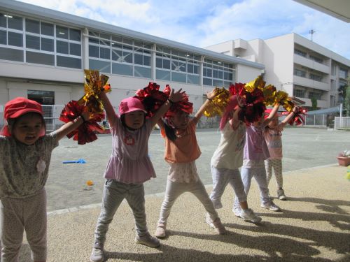 10月4日(土曜日)に運動会が行われました。保護者の方に応援してもらい、最後まで精一杯頑張りました。「ドキドキしたけれど楽しかった」「またやりたいな」と話していた子どもたち。戸外遊びでは、運動会の余韻を楽しむ”運動会ごっこ”が盛り上がっています。他学年のお友達に、ダンスで使う道具を貸してあげたり、踊り方を教えて一緒に踊ったりし、異年齢での交流も深まっています。
