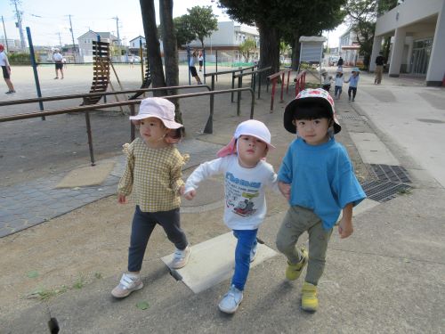 [2歳児]小グラウンドまで保育者や友達と手をつないで行きます。