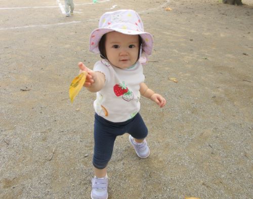 園庭や小グラウンドに落ちている色とりどりの落ち葉や肌に触れる冷たい風を感じ、秋が深まる頃となりました。子どもたちは、気に入った落ち葉を見つけては保育者に見せたり、集めたりちぎったりして秋ならではの遊びを楽しんでいます。また、乳児庭から園庭、園庭から小グラウンドへと活動の場を広げ、探索や運動遊びを楽しんでいる子どもたちです。