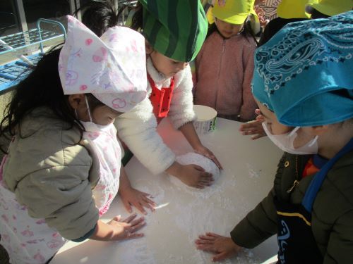 餅がつき上がると、鏡餅づくりが始まりました。くるくると回しながら成形し、きれいな丸い形に仕上がりました!年神様をお迎えするために玄関やこどもセンターに飾っている鏡餅、1月9日の鏡開きも楽しみにしているこども達です!