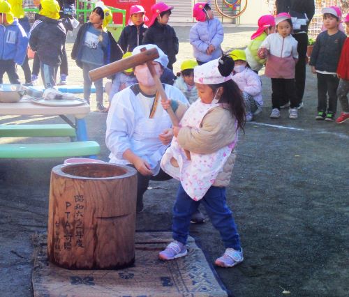 5歳児が餅つきを行いました。1週間前から展示されていた大きな臼や杵を見て、期待を膨らませていたこども達。