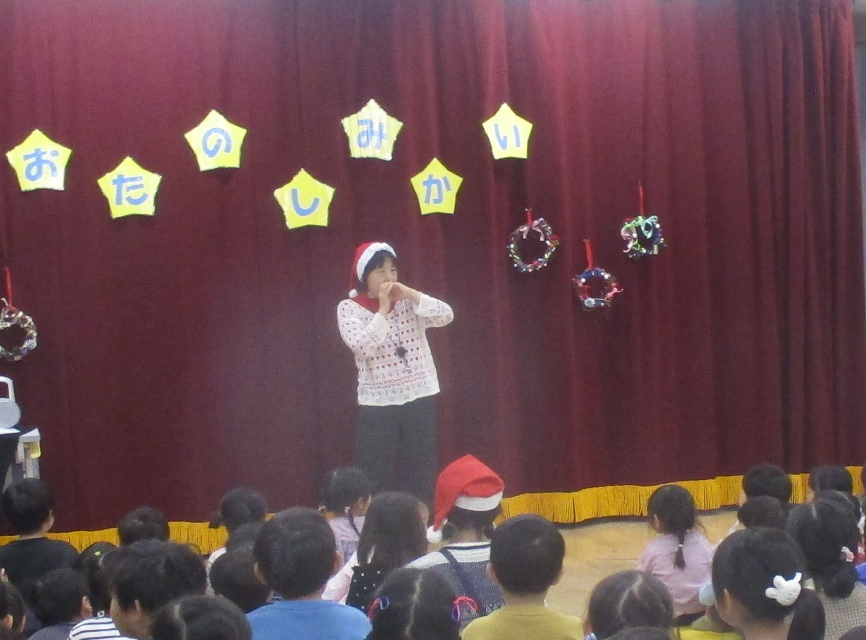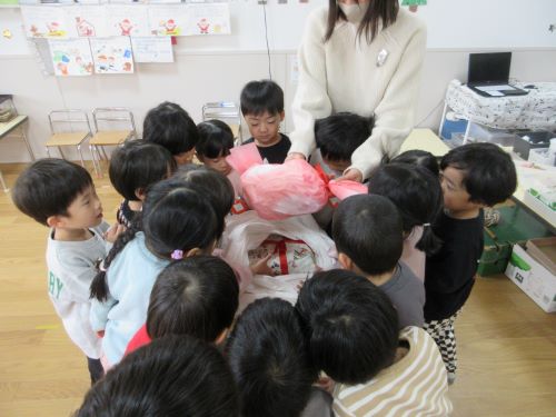 幼児組ではこども達の作品が会場を彩り、指笛の先生の演奏に合わせて歌や踊りを楽しみました。会の終わりには、どこからか鈴の音が…クラスに戻ると素敵なプレゼントが届いており、目を輝かせていたこども達です!