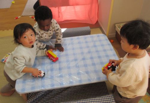 5歳児がお客さんとして来てくれた4歳児の友達を優しくサポートしています。