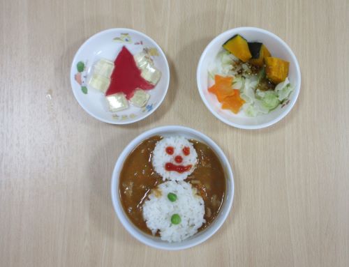 乳児組では職員によるエプロンシアターやパネルシアター、マジックを見たり、「うさぎ野原のクリスマス」を保育者と一緒に踊ったりして、クリスマスの雰囲気を楽しみました。かわいらしい給食やおやつにも大喜びのこども達でした!