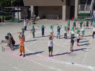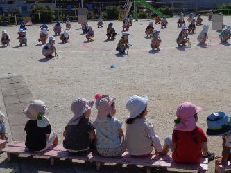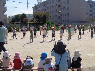 園庭で、年長組の踊りが始まると、乳児組の子どもたちは興味をもって見たり、真似をして踊ったりする可愛い姿が見られます。乳児クラスの子どもたちは、お兄さん、お姉さんの姿に憧れをもち、また、年長組の子どもたちは、見てもらうことで、自信をもって踊る姿となっています。