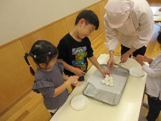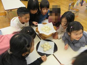 出来上がりの団子を見て、「つやつやしているね!」「美味しそう〜」「いい匂いがする」と、喜んでいました。