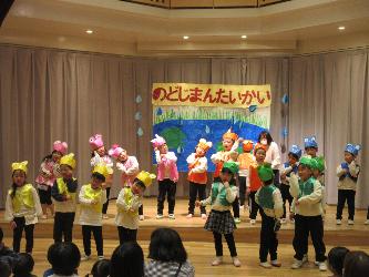 4歳児ひまわり組は「かえるののどじまん」 ゆり組は「ねこのおいしゃさん」 の劇を披露しました。元気に踊ったり、歌ったり可愛らしい姿でした。