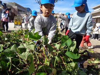 「大きなお芋が出てくるかな?」とワクワクしながら芋づるを引っ張っています。