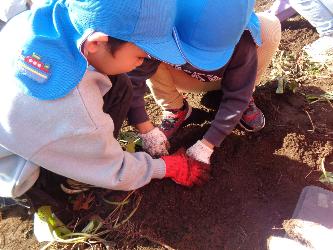 5歳児クラスの子どもたちが芋苗を植えをしました。畑の雑草を取り除き、芋苗を植える準備も子どもたちが行いました。先生から芋苗の植え方を教えてもらい、一人ひとつ植えました。「大きなお芋になってね!」「たくさんお芋ができるといいな」と、これからの芋の生長を楽しみにしている子どもたちです。