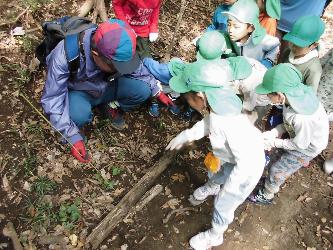 「ここに小さなねずみがいるよ!」と教えてもらい、みんなで観察です。自然の中で植物や動物に出会う貴重な経験でした。