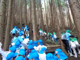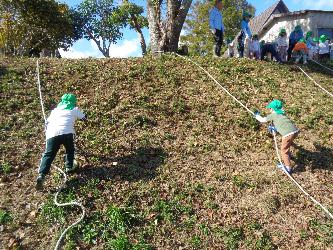 ロープを使って斜面を降ります。鹿野山少年自然の家の周辺には、自然を利用した遊具があります。