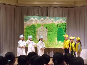 5歳児年長組が生活発表会で合奏や歌、劇を行いました。劇では、「こんなセリフはどう?」と友達と意見を出し合ったり、友達の良いところを認め合ったりして、クラスのみんなで劇を作り上げました。大道具や小道具、背景も自分達で作りました!
