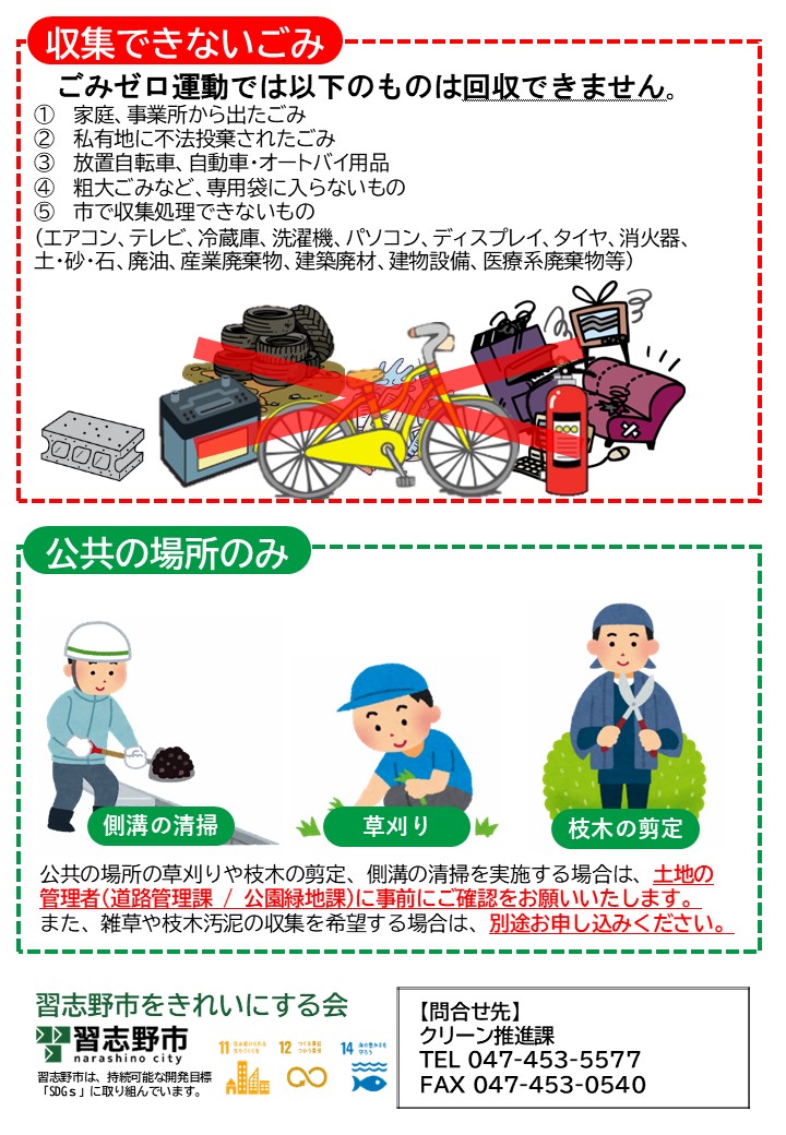 ※ごみゼロ運動は、市内の道路、公園及び駅前広場など、公共の場所の清掃を目的としていることから、家庭、事業者など私有地から出されたごみは回収いたしません。