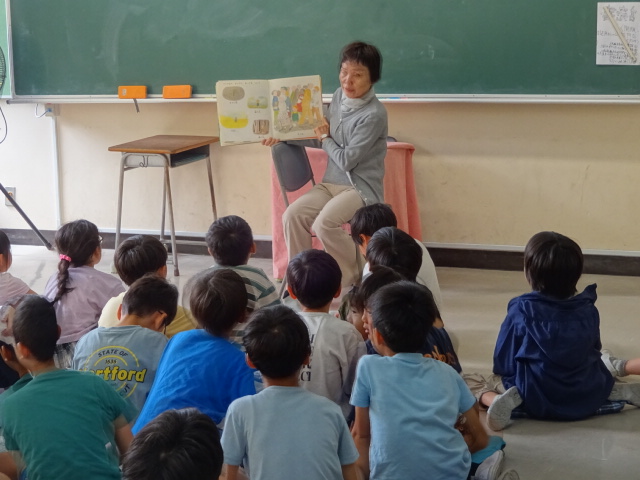 藤崎文庫の皆さんが読み聞かせに来てくださいました。楽しい話に笑い声があふれます。