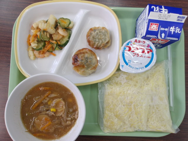 シーフードサラダ にらまんじゅう 中華麺 味噌ラーメンスープ 牛乳 ヨーグルト
