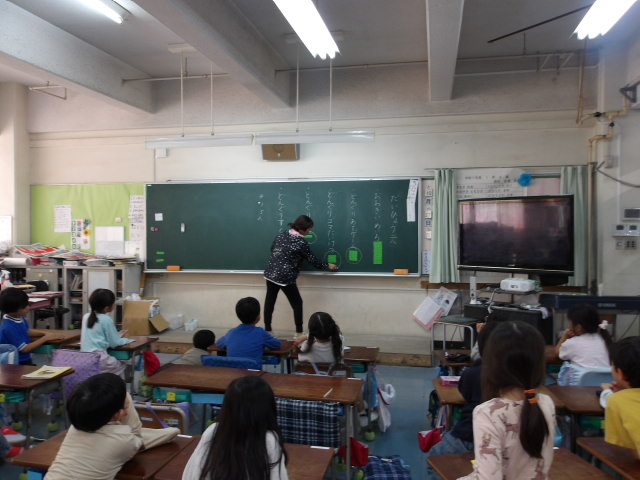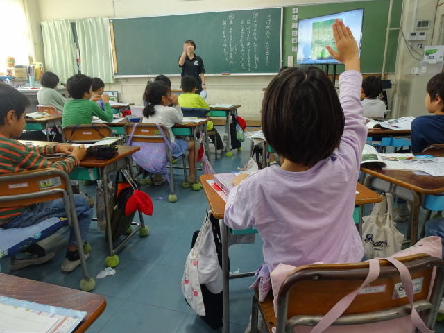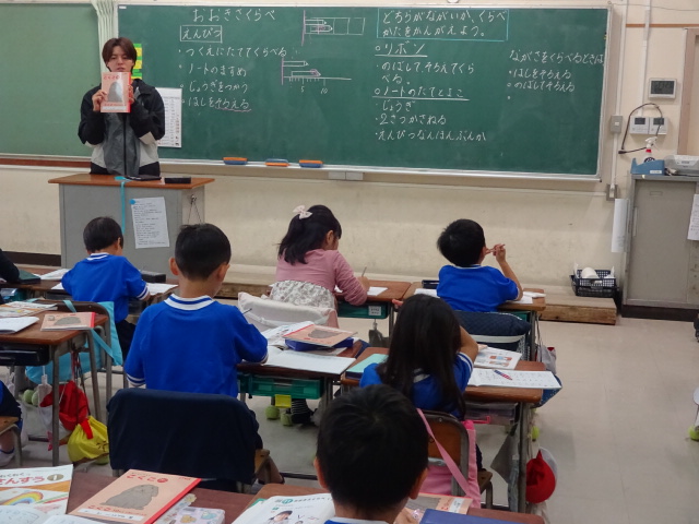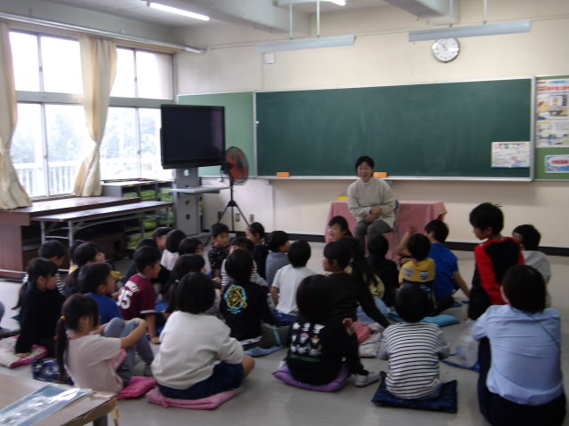 おはなし会では、読み聞かせだけでなくクイズなど楽しく参加できるよう工夫してくださっています。2年生が、答えを一生懸命考えています。