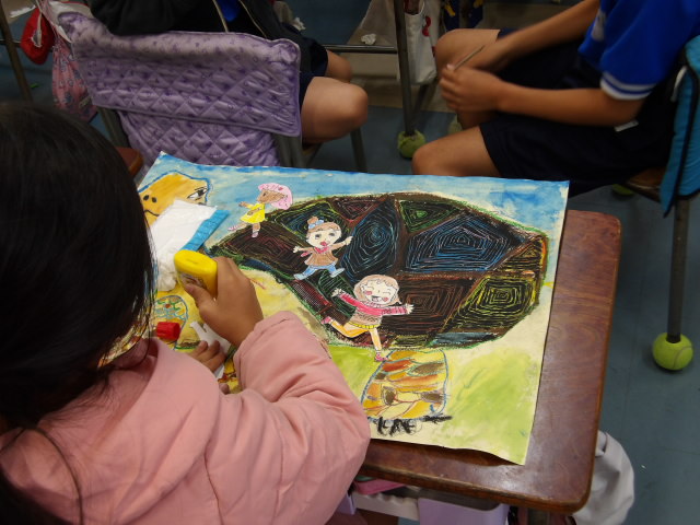 2年生は、大きなリクガメと楽しそうに遊んでいる様子を描いています。そろそろ仕上げのようです。