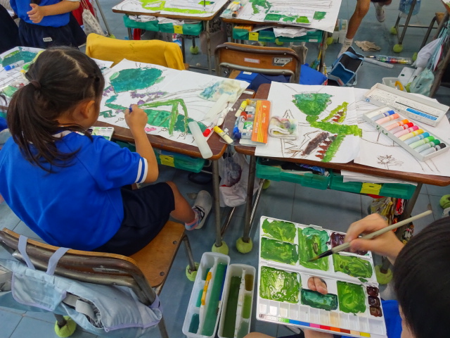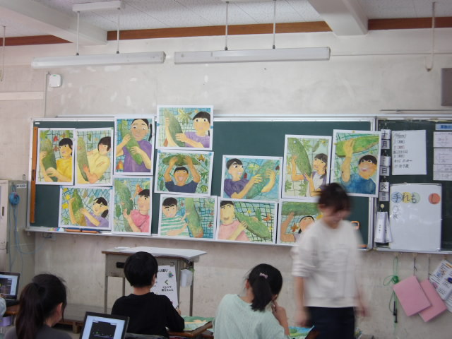 4年生のゴーヤの絵も、完成に近づいています。色の塗り方が上手ですね。