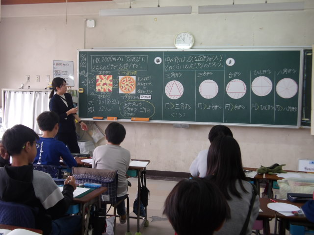 円の面積の学習です。正方形と円の形のピザ、どちらが大きくてお得でしょう?