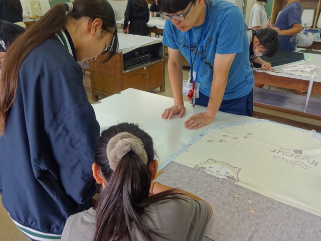 エプロン用の大きな布を裁ちばさみで切っています。これからミシン操作に進みます。