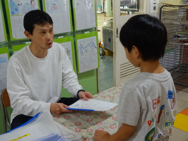 1年生にとって初めての通知表です。半年間がんばってきたことを一人一人に伝えています。