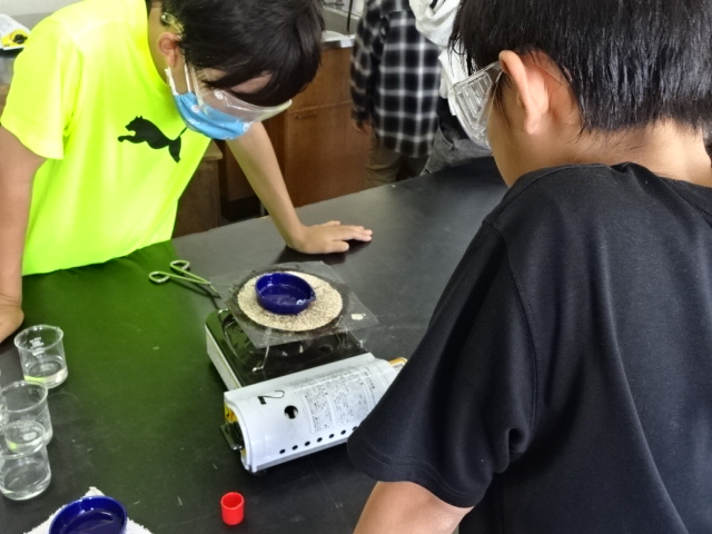 水の中に何が溶けているか調べます。安全への配慮からアルコールランプはもう使っていません。