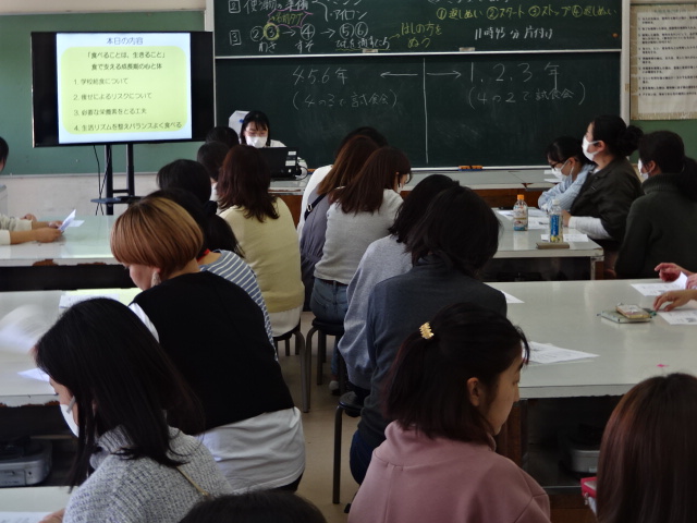 PTAによる給食試食会です。栄養教諭による講話を聞き、本日の給食を実食します。