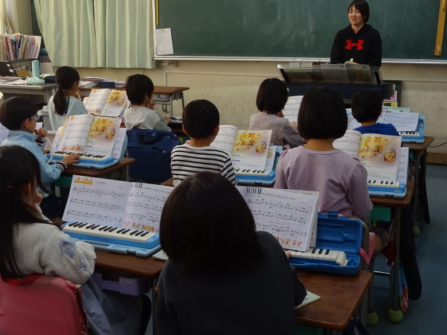 教室から鍵盤ハーモニカの音が聞こえてきました。息をそろえて曲を演奏しています。