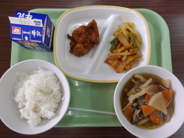 じゃがいものカレー炒め 鶏のから揚げ ご飯 けんちん汁 牛乳 今日はみんなが大好きなから揚げでした。カレー炒めも、ピリ辛で美味しかったです!