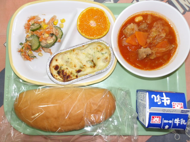 ツナサラダ かぼちゃのグラタン コッペパン トマトポトフ 牛乳 はなみかん 具沢山なトマトポトフは、酸味がありましたが美味しかったです。