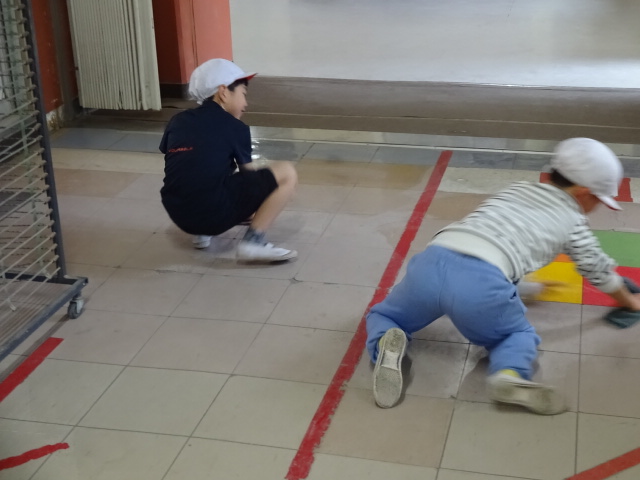1年生が廊下を雑巾がけしています。とっても素早い動きで床がどんどんきれいになっていきます。