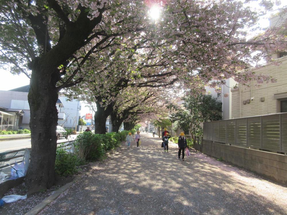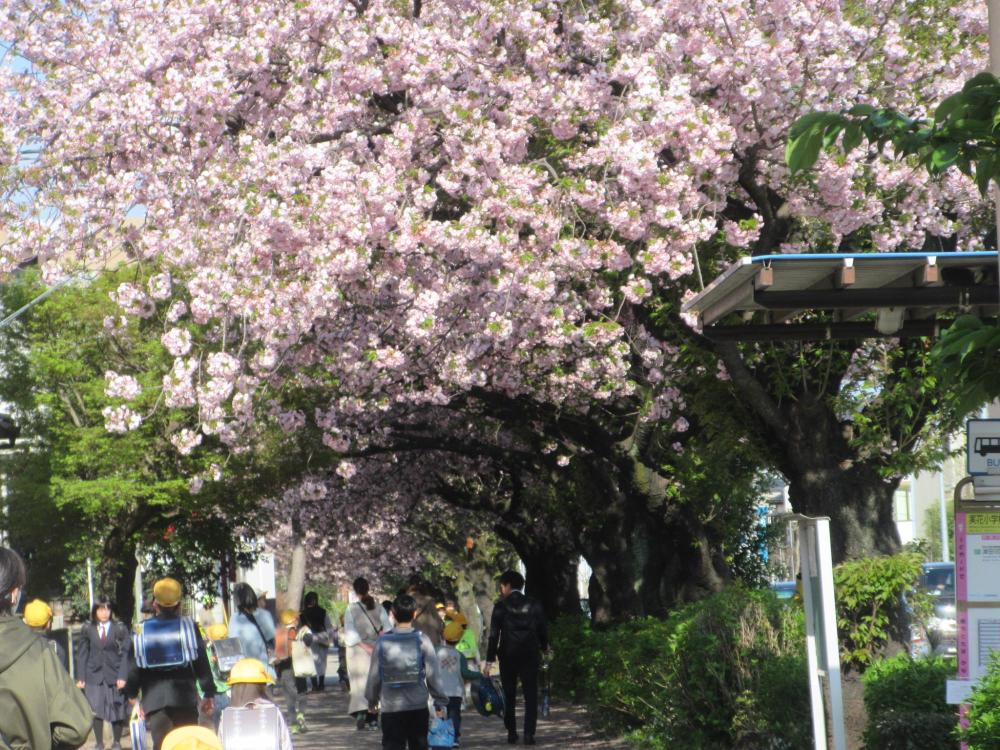 満開の桜のマラソン道路を子供たちが登校してきました。