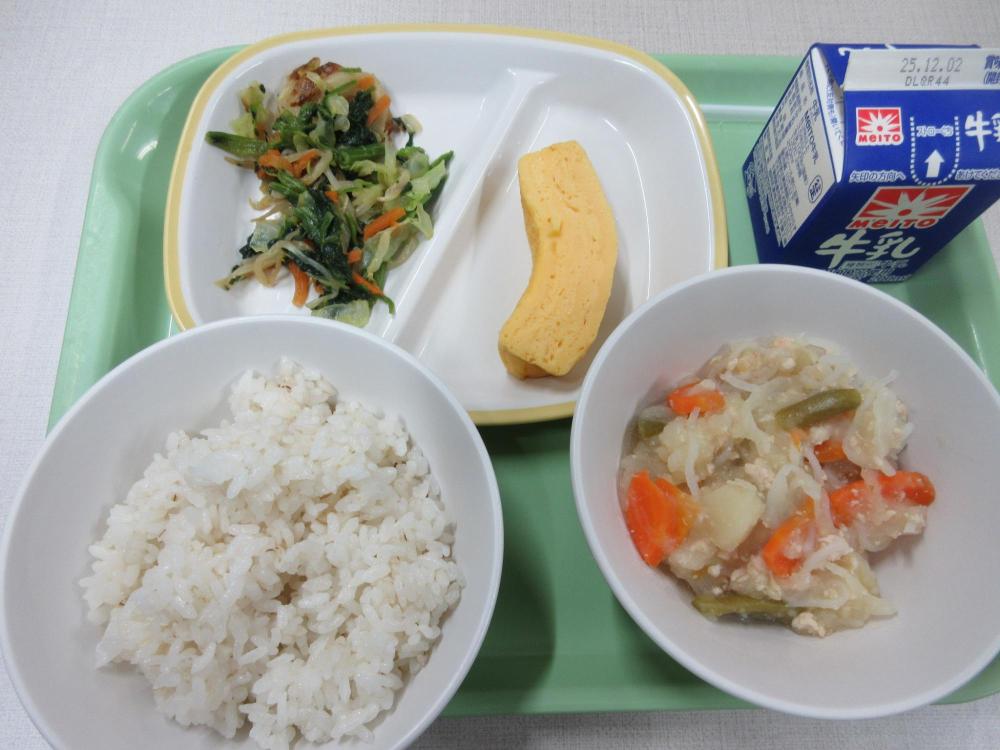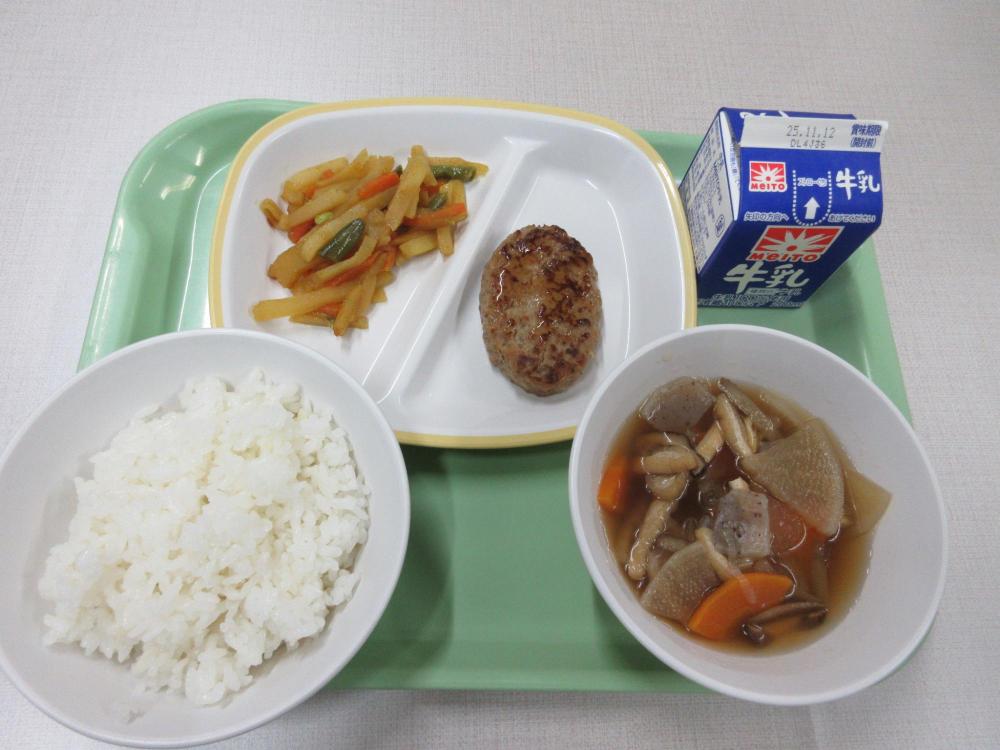 ご飯 けんちん汁 ジャガイモのカレー炒め 照り焼きハンバーグ 牛乳
