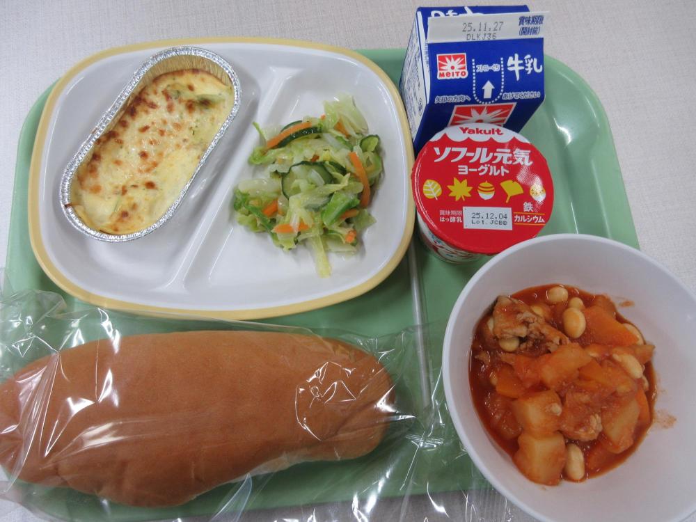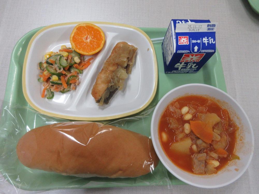 牛乳 コッペパン 鮭のオニオンソースがけ トマトポトフ ツナサラダ はなミカン