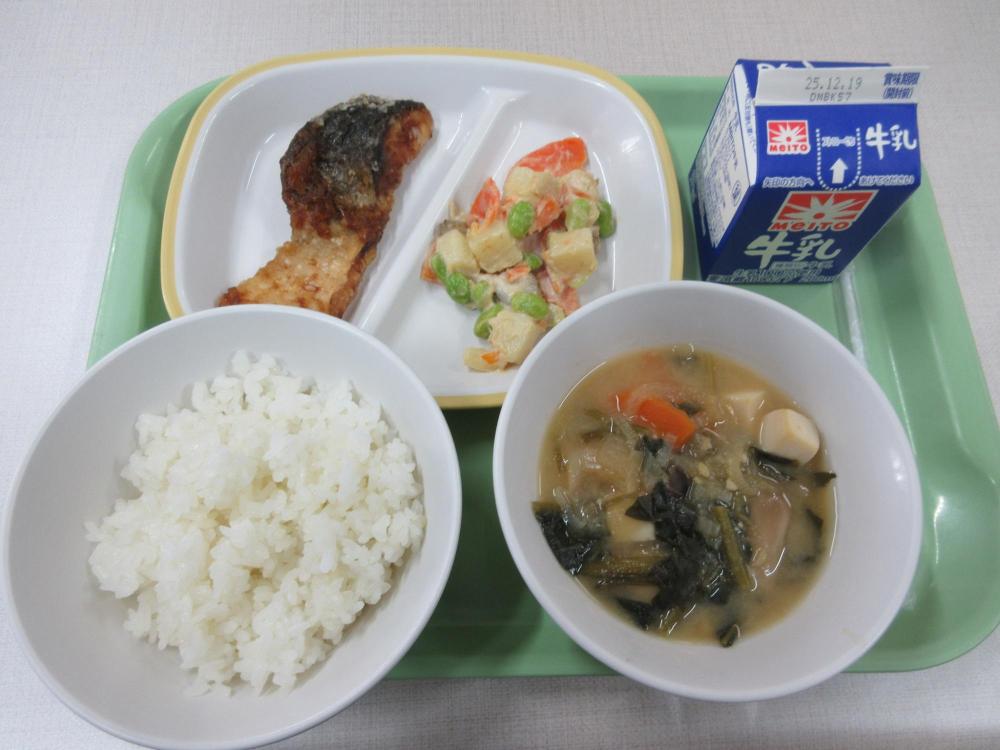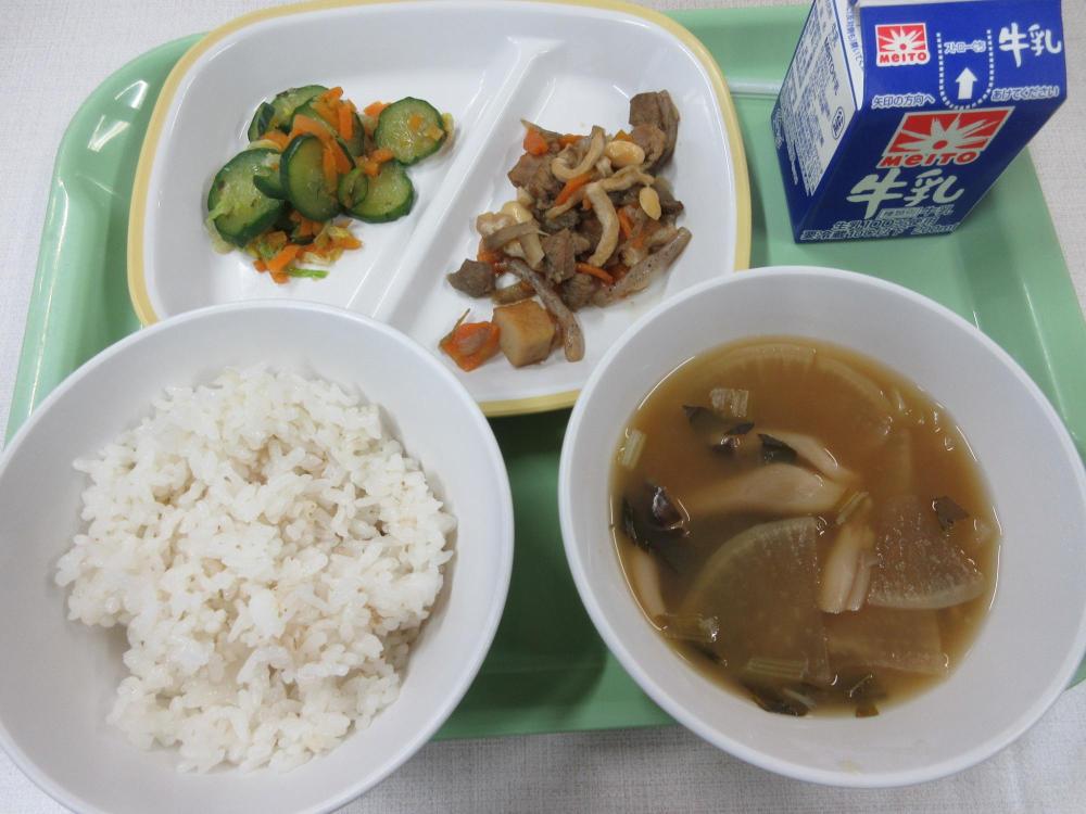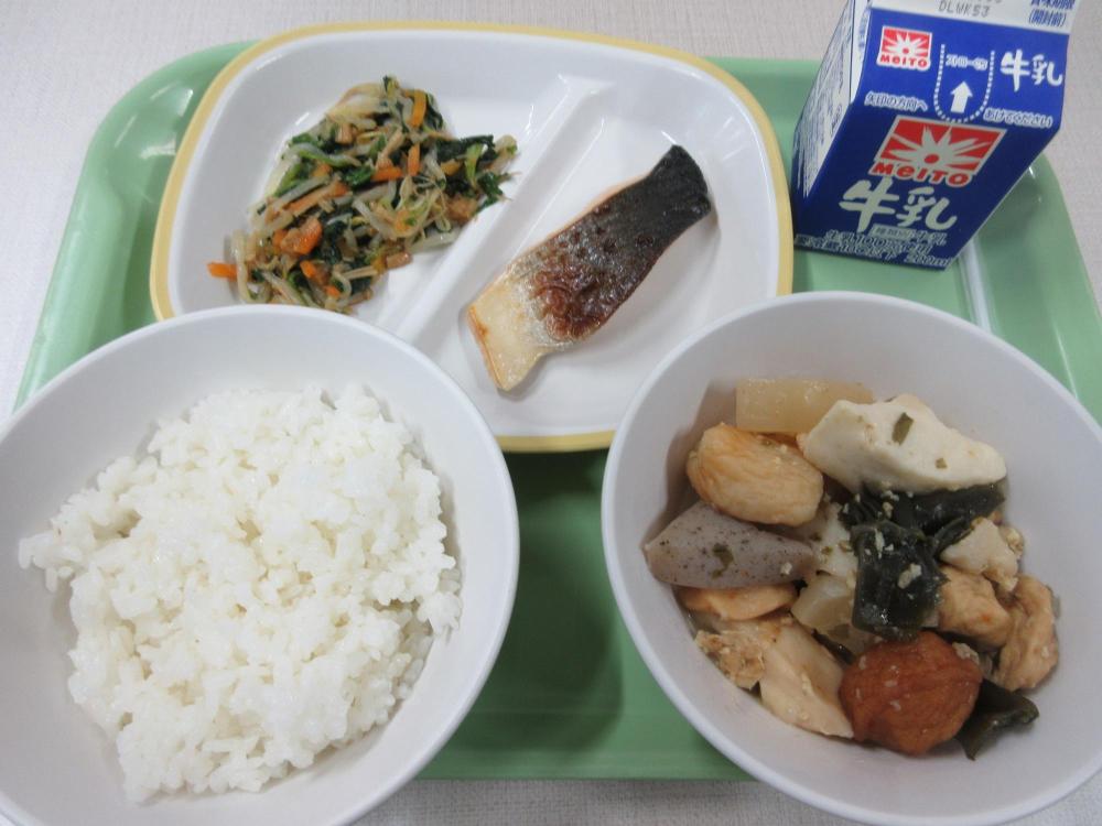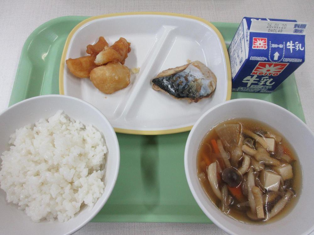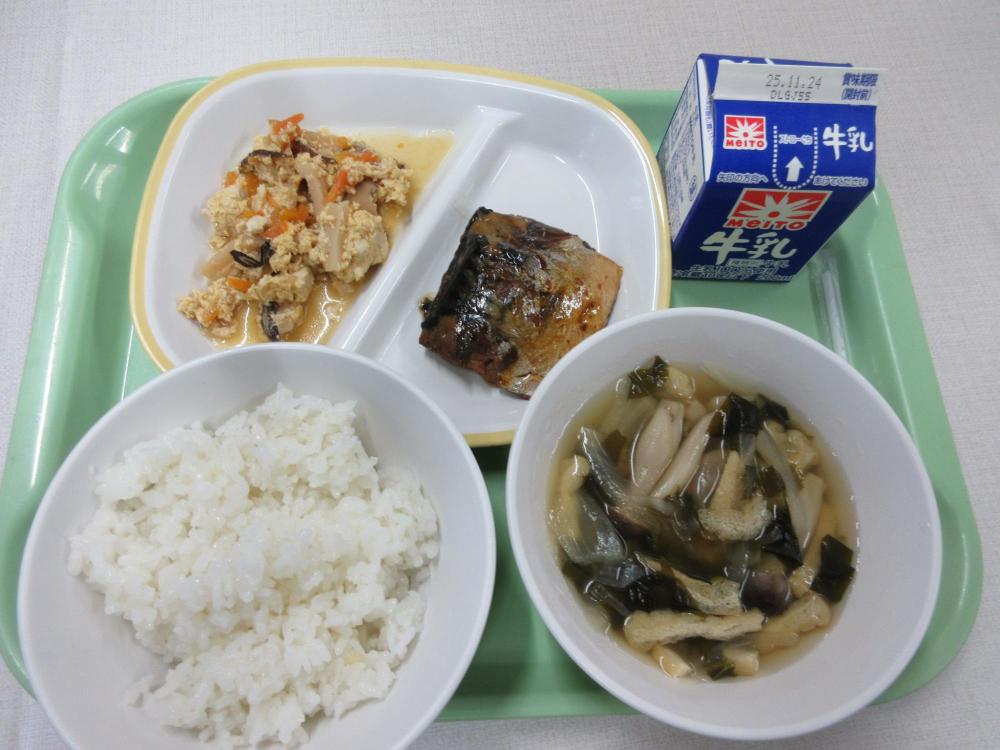 ご飯 鯖の生姜煮 炒り豆腐 きつね汁 牛乳
