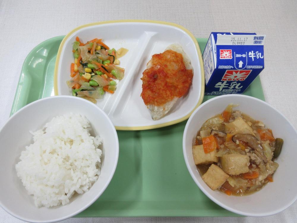 ご飯 白身魚のチリソース ジャーチャンン豆腐 こんにゃくサラダ 牛乳