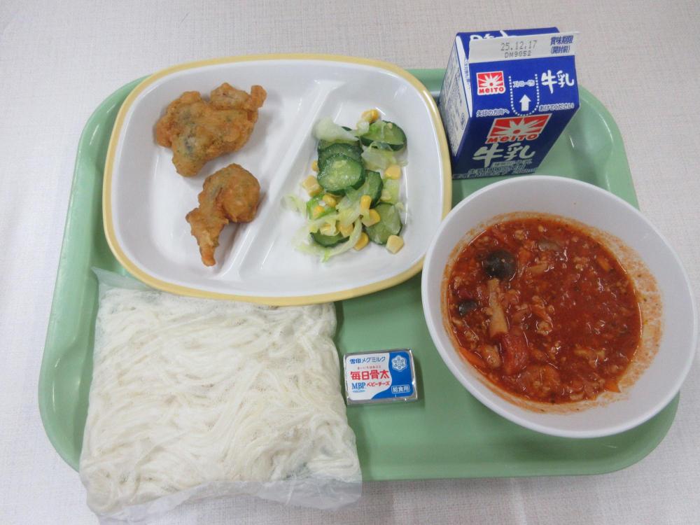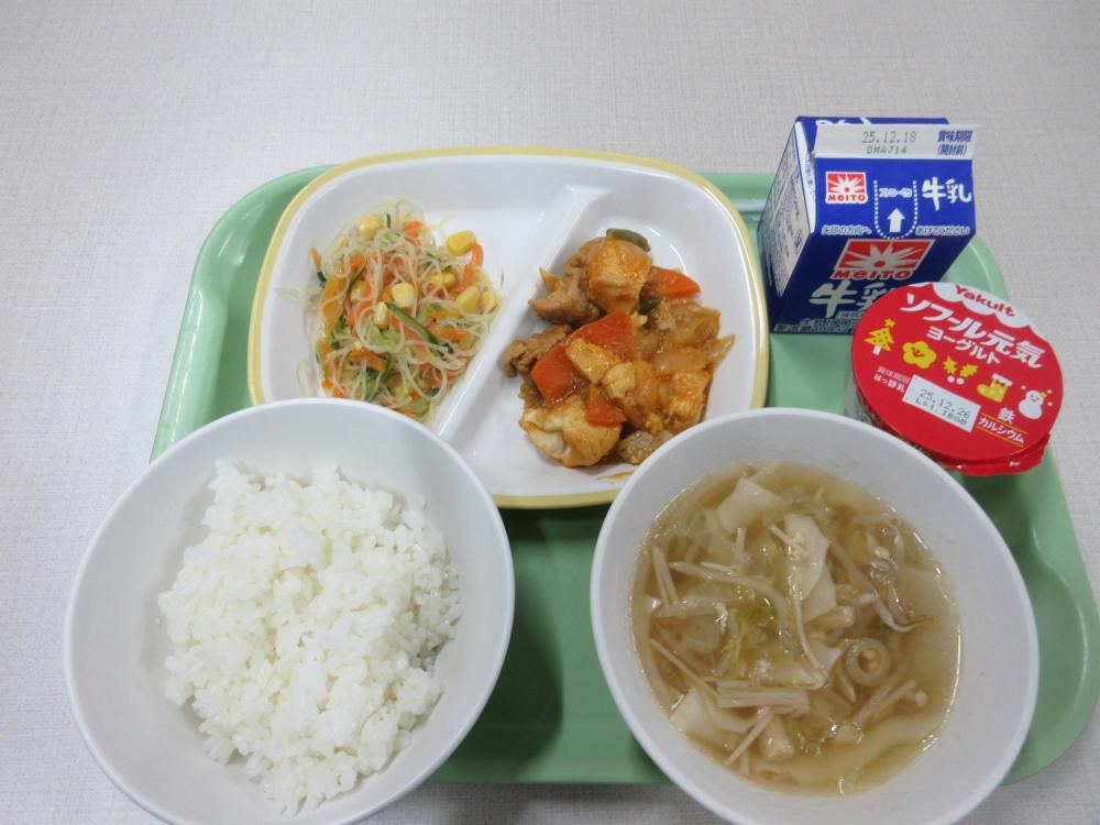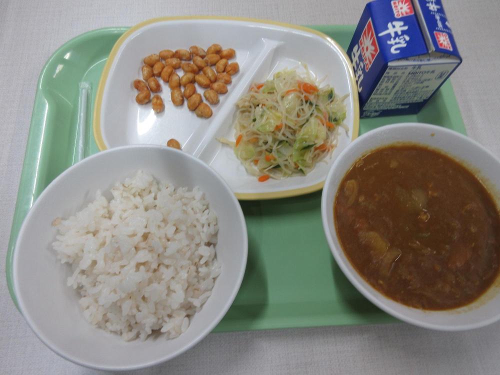 麦ご飯 チキポップビーンズ チキンカレー 春雨サラダ 牛乳
