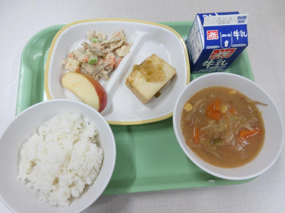 ご飯 ちゃんぽん味噌汁 ごぼうサラダ 揚げ出し豆腐 リンゴ 牛乳