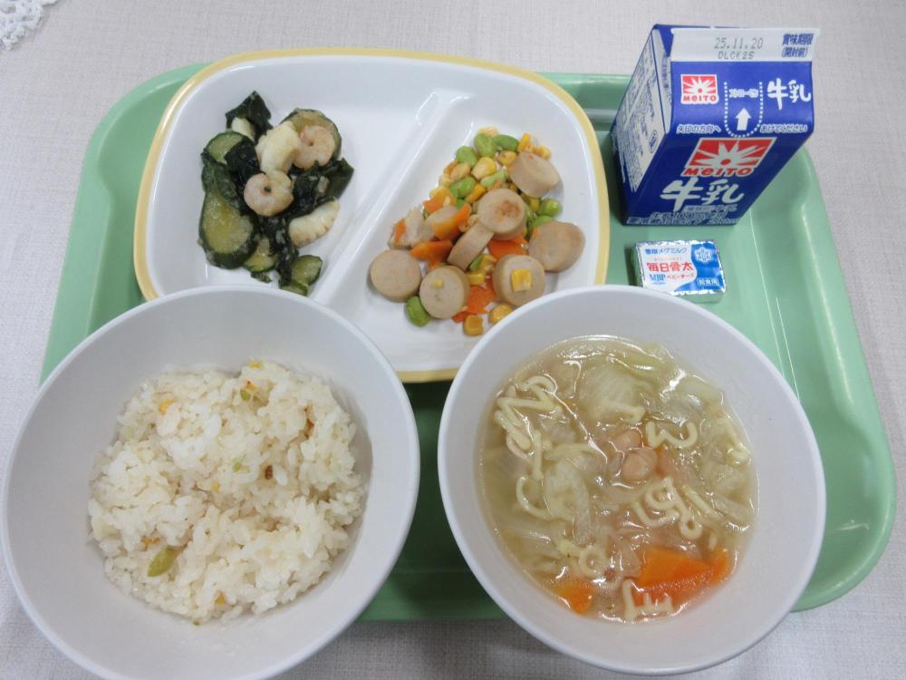コーンピラフ ウィンナーソテー ABCスープ シーフードサラダ 角切りチーズ 牛乳