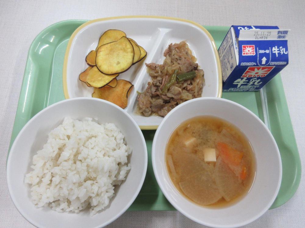 麦ご飯 豚丼の具 つみれ汁 サツマイモチップス 牛乳